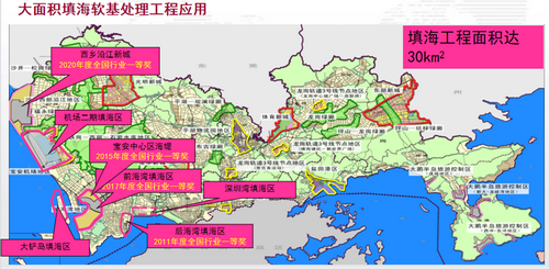 改革開放之初,由于城市建設(shè)用地日益緊張,深圳這座沿海城市在全國最早開展了大規(guī)模填海造地。深勘集團(tuán)有幸參與了深圳城市圍海造地建設(shè)全過程,從早期的港口、機(jī)場、碼頭的圍海造地到后期城市建設(shè)的圍海造地;從皇崗口岸、福田保稅區(qū)的建設(shè),到深圳灣、后海灣、前海灣、寶安中心區(qū),再到西鄉(xiāng)、福永、沙井等地區(qū)的大型土地整備項目,深勘集團(tuán)累計負(fù)責(zé)設(shè)計和咨詢的圍海造地面積達(dá)到20km2以上。其中后海灣、前海灣、寶安海堤、西部濱海新城等幾個大型填海軟基處理項目均獲得了國家行業(yè)一等獎。