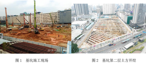 該項(xiàng)目位于深圳市福田區(qū),場地南臨八卦三路,西鄰上步北路,北臨泥崗西路。場地南側(cè)為已施工的地鐵七號(hào)線八卦嶺站,八卦嶺站的站廳層伸入本項(xiàng)目紅線5.8m,支護(hù)樁距離站廳層邊界凈距3m,西側(cè)為規(guī)劃的地鐵六號(hào)線區(qū)間隧道,東北側(cè)為國安居建材市場。本項(xiàng)目共五層地下室,分為一期、二期開發(fā)。一期基坑支護(hù)設(shè)計(jì)周長為625.01m,基坑面積為22803.65㎡,基坑周邊地面標(biāo)高為絕對(duì)標(biāo)高22.31~24.83m,基坑深24.71~27.23m?;硬捎萌冷摻罨炷羶?nèi)支撐+地下連續(xù)墻支護(hù),基坑深度約22米,基坑周長約510m。深勘集團(tuán)承擔(dān)本項(xiàng)目的監(jiān)測工作。