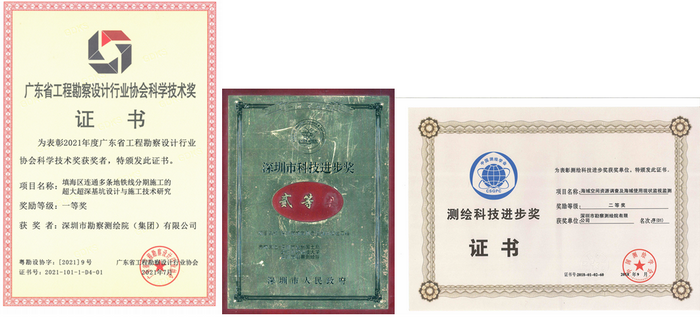 深勘近年開展建設(shè)科研項目150余項,產(chǎn)生科技成果項目80余項?!斑吰路€(wěn)定性預(yù)測預(yù)報及垮塌控制技術(shù)研究”獲實用新型專利4項、發(fā)明專利1項;發(fā)表SCI、核心期刊論文10篇;申報為2016年深圳市科技創(chuàng)新委員會技術(shù)公關(guān)項目,獲政府獎勵資助?!昂S蚩臻g資源調(diào)查及海底使用現(xiàn)狀監(jiān)視監(jiān)測”、“大比例尺精細(xì)化多源空間信息集成獲取技術(shù)及動態(tài)監(jiān)測應(yīng)用”、“多源空間信息集成獲取技術(shù)研究及在城市地形圖動態(tài)修補測中的應(yīng)用”等研究分別獲2018中國測繪學(xué)會測繪科技進(jìn)步二等獎、2019中國地理信息產(chǎn)業(yè)協(xié)會科技進(jìn)步二等獎、2019中國衛(wèi)星導(dǎo)航定位協(xié)會科學(xué)進(jìn)步獎,在深圳市政府專題項目及基礎(chǔ)測繪中廣泛應(yīng)用,社會、經(jīng)濟效益顯著。2021年“填海區(qū)連通多條地鐵線分期施工的超大超深基坑設(shè)計與施工技術(shù)研究”榮獲廣東省優(yōu)秀勘察設(shè)計行業(yè)協(xié)會科學(xué)技術(shù)獎。