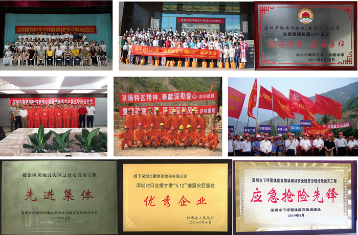 多年來,深勘始終堅持企業(yè)經(jīng)濟責(zé)任和社會責(zé)任有機統(tǒng)一,企業(yè)自身發(fā)展的同時,致力履行社會責(zé)任,積極參與公益事業(yè),良好的企業(yè)公民形象贏得了社會各界、政府部門的好評。深勘技術(shù)團隊義不容辭地支持深圳建設(shè),在地災(zāi)、應(yīng)急管理、地下空間施工技術(shù)、安全方面給予建設(shè)主管部門、業(yè)主無償?shù)募夹g(shù)支持。深勘曾被中國規(guī)劃協(xié)會、深圳市政府、甘肅、隴南地方政府授予“援建先進(jìn)單位”、“5.12”地震災(zāi)后重建優(yōu)秀企業(yè)。深圳光明新區(qū)滑坡災(zāi)害,調(diào)查組對深勘積極參與救援的態(tài)度及強有力的技術(shù)支持給予高度認(rèn)可,市領(lǐng)導(dǎo)及國務(wù)院專家組對其規(guī)范化的現(xiàn)場作業(yè)和質(zhì)量報告給與最高評價。深勘還捐資助學(xué)、設(shè)立獎教獎學(xué)金,黨委、工會設(shè)立扶貧濟困、捐資助學(xué)基金,對口資助山區(qū)貧困失學(xué)兒童。新冠疫情期間積極向各級慈善組織捐款,減免承租商戶租金。