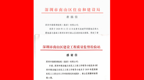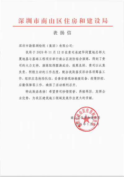 2020年11月12日,在深勘集團承建的華潤置地總部大廈地基與基礎(chǔ)工程項目中,開展了由南山區(qū)住房和建設(shè)局主辦,深勘集團協(xié)助承辦的南山區(qū)消防綜合演練,演練取得圓滿成功,效果良好。南山區(qū)住房和建設(shè)局為深勘集團在此次活動中認真負責、積極主動的態(tài)度特此致函,以示表揚。望深勘集團珍惜榮譽,再接再厲,繼續(xù)為南山區(qū)建筑施工領(lǐng)域發(fā)展作出更大貢獻。