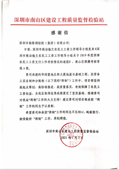 為有效保障農(nóng)民工工資權(quán)益,規(guī)范建筑行業(yè)管理,推進項目信息化管控,深勘集團一直堅持落實實名制和分帳制工作。華潤置地總部大廈地基與基礎(chǔ)工程項目部更是堅持高起點籌劃、高標準推進、高質(zhì)量落實。為南山區(qū)在關(guān)于“兩制”的相關(guān)考核中打下了夯實的基礎(chǔ),深圳市南山區(qū)建設(shè)工程質(zhì)量監(jiān)督檢驗站為此特向深勘集團致函感謝,希望在以后的工作中深勘集團和擔任“兩制”工作的同志能夠不忘初心,砥礪前行,繼續(xù)做好“兩制”工作,再創(chuàng)輝煌。