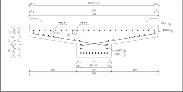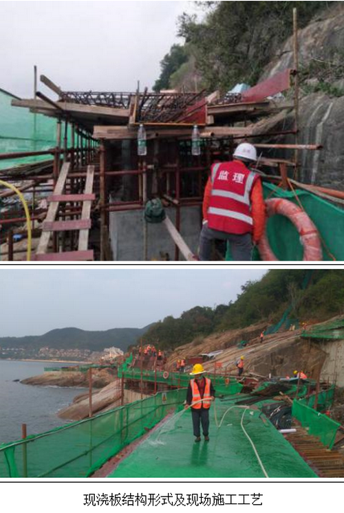 棧道橋面整體高度比原棧道基準(zhǔn)面高1-2米,使?jié)q潮時海浪不會直接沖擊橋面,抵抗臺風(fēng)的能力更強。正常棧道橋面使用現(xiàn)澆板“T”型結(jié)構(gòu),中間厚度為700mm,邊緣厚度為250mm,翼緣根部厚度為400mm,頂寬約為3.0m。