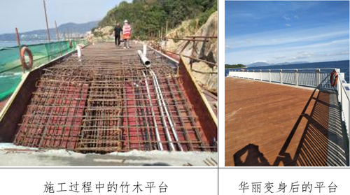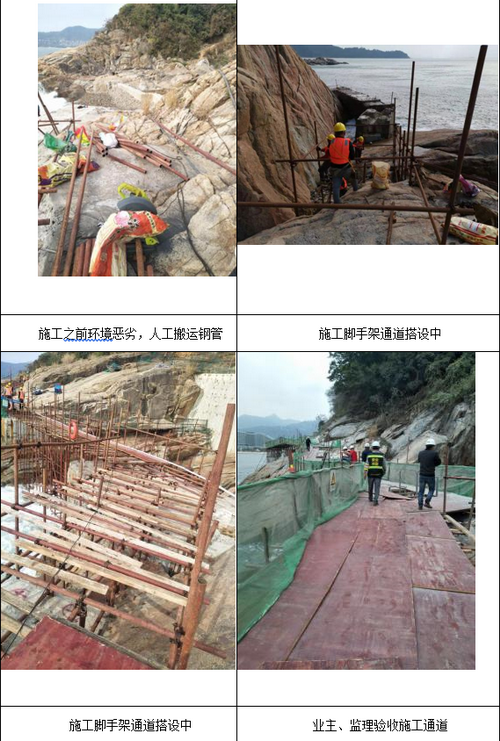 本工程依山臨海,大部分為陡峭巖壁、少數(shù)為亂石漫灘,原始地貌、山林、海域都是環(huán)境控制保護區(qū)域,對生態(tài)保護提出了高要求。為了攻克難關(guān),項目組成員集思廣益、因地制宜,發(fā)揮出逢山開路、遇水搭橋的干勁,人為的用鋼管腳手架搭設(shè)了一條1.3公里的施工便道,以便設(shè)備、材料的周轉(zhuǎn)。