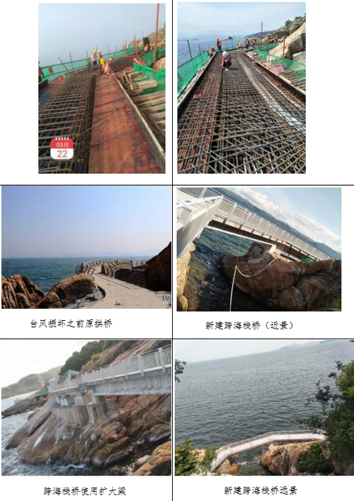 本工程第二大亮點,在跨海部位,項目部與設(shè)計方商討采用擴大基礎(chǔ)的方式增加了板下主梁的結(jié)構(gòu),使其受力更合理,承重效果和抗臺風(fēng)能力更強,與原橋相比,新橋更具新穎性,造型奇特而不失美感,現(xiàn)代感十足。
