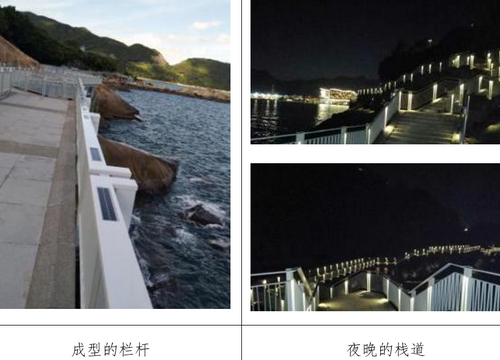 小梅沙棧道欄桿是第四個亮點。其一,采用氟碳烤漆這一種新工藝。白天,乳白色的氟碳烤漆,簡約而不失優(yōu)雅,遠遠望去像一條蜿蜒起伏的長龍,從大海中飛騰而起。這種欄桿均是工廠生產(chǎn),項目組派專業(yè)技術(shù)人員駐場嚴格把控各道工藝流程,特別是對防腐做出了最高要求;另一大特點,欄桿采用一種新型式太陽能集電板集照明一體化,合理使用欄桿空間,照明體系與構(gòu)筑物完美融合,白天欄桿扶手上一塊塊小小的方形太陽能板靜靜的吸收著太陽能,它們光彩奪目,從遠處望去,好像兩排閃閃發(fā)光的星辰;當(dāng)夜晚來臨,欄桿就亮了起來,從遠處望去好一條燈帶,為寧靜的海邊增添了光彩,同時也結(jié)束了棧道常年無燈源的歷史,讓人們一睹小梅沙棧道不為人知的夜景。每天晚上7點半到早上6時通過自動感光開閉,走近棧道欄桿處,你才會驚奇的發(fā)現(xiàn)它們是多么的特別,由1000多個LED小光源組成匯集,淡黃色的光圈下有一種朦朧之美,不多說了到時候大家親身去體驗。
