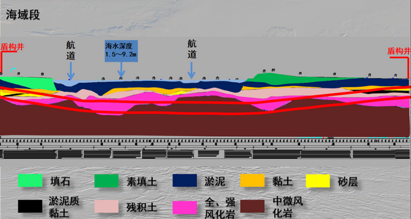 媽灣跨海通道海底隧道采用15.55米超大直徑氣墊式泥水平衡盾構(gòu)機(jī)進(jìn)行掘進(jìn)施工,開挖斷面面積是常規(guī)地鐵盾構(gòu)機(jī)的6倍。線址工程地質(zhì)和水文地質(zhì)條件極為復(fù)雜,盾構(gòu)機(jī)在淺覆土工況下始發(fā),既要在填海區(qū)深厚軟弱地層中掘進(jìn),又要克服長距離、大埋深、大坡度、高水壓等海底隧道施工世界級難題,包括穿越上軟下硬、軟硬不均、全斷面堅(jiān)硬巖地層及斷層破碎帶等。盾構(gòu)隧道海域段覆土厚度20.9m~28.6m,最大水深為9.2m,盾構(gòu)掘進(jìn)施工難度很大、風(fēng)險(xiǎn)極高。項(xiàng)目勘測手段豐富多樣,針對性強(qiáng),勘測成果準(zhǔn)確可靠,結(jié)論建議安全合理,后期服務(wù)配合到位。從盾構(gòu)下線,到掘進(jìn)過程,直至順利貫通,深勘集團(tuán)全過程提供技術(shù)支持和服務(wù),讓掘進(jìn)施工有“?!笨梢?,為工程安全保駕護(hù)航。