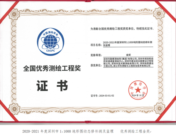 大會頒發(fā)了優(yōu)秀地圖作品裴秀獎、優(yōu)秀測繪工程獎、夏堅白測繪事業(yè)創(chuàng)業(yè)與科技創(chuàng)新獎、科技創(chuàng)新型優(yōu)秀單位獎等獎項。由深勘集團主導、深圳市規(guī)劃和自然資源調(diào)查測繪中心等6家單位聯(lián)合申報的“2020-2021年度深圳市1:1000地形圖動態(tài)修補測及監(jiān)理”項目獲得優(yōu)秀測繪工程金獎(序號02)。