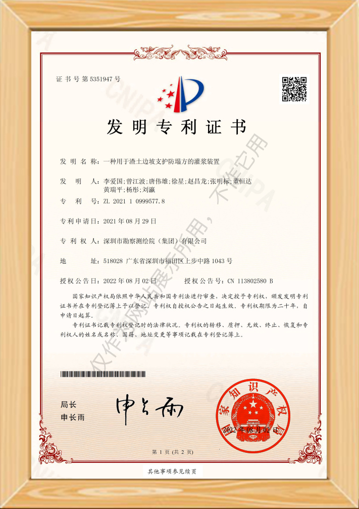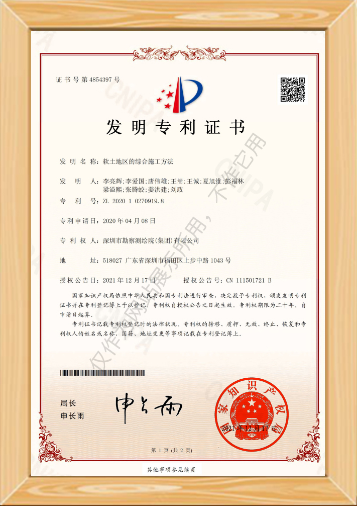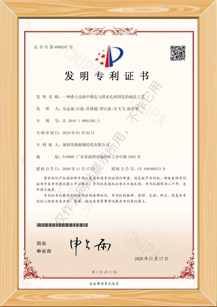 公司成立以來(lái),完成各類(lèi)工程三萬(wàn)余項(xiàng),榮獲國(guó)家、省(部)、市級(jí)優(yōu)秀工程獎(jiǎng)500余項(xiàng),其中國(guó)家級(jí)金獎(jiǎng)15項(xiàng)、銀(質(zhì))獎(jiǎng)31項(xiàng)、銅獎(jiǎng)27項(xiàng)。公司主編和參編國(guó)家標(biāo)準(zhǔn)、行業(yè)標(biāo)準(zhǔn)、地方標(biāo)準(zhǔn)和團(tuán)體標(biāo)準(zhǔn)共47本、擁有24項(xiàng)發(fā)明專(zhuān)利、59項(xiàng)實(shí)用新型專(zhuān)利和54項(xiàng)軟件著作權(quán)。參編的國(guó)家標(biāo)準(zhǔn)GB50021-94《巖土工程勘察規(guī)范》,獲部級(jí)科技進(jìn)步二等獎(jiǎng);參編的深圳市標(biāo)準(zhǔn)SJG04-96《深圳地區(qū)地基處理技術(shù)規(guī)范》獲市科技進(jìn)步三等獎(jiǎng),曾多次入選全國(guó)勘察設(shè)計(jì)百?gòu)?qiáng)單位。公司于2010年,成為深圳市首批國(guó)家高新企業(yè)認(rèn)定企業(yè),2015年成立企業(yè)研發(fā)中心,自成立以來(lái)共研發(fā)了30項(xiàng)科技項(xiàng)目,均成功實(shí)現(xiàn)科技成果轉(zhuǎn)化,年均成果轉(zhuǎn)化6項(xiàng)以上,2017年通過(guò)了知識(shí)產(chǎn)權(quán)管理體系(符合標(biāo)準(zhǔn):GB/T29490-2013)認(rèn)證,同時(shí),我司與深圳大學(xué)、武漢大學(xué)、中國(guó)地質(zhì)大學(xué)(武漢)簽訂校企合作協(xié)議,整合優(yōu)勢(shì),共同推動(dòng)人才的培養(yǎng)和科學(xué)研究。